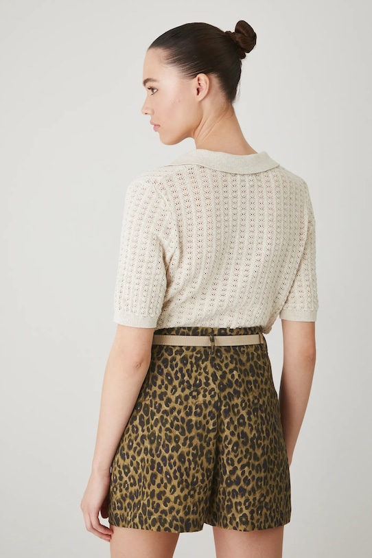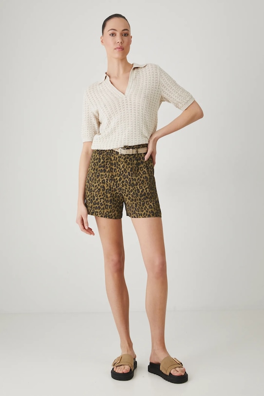 Шорты из коллекции Medicine. Изготовлены из смесовой льняной ткани. - Материал с добавлением льна обеспечивает комфорт и воздухопроницаемость. - Обычная посадка. - Модель с высокой талией, застежкой на молнию и крючок. - Ремешок в комплекте. - Декоративные закладки. - Узорчатая ткань. - Леопардовый узор. - Ширина талии: 37 см. - Ширина бедер: 50 см. - Высота талии: 33 см. - Ширина штанины внизу: 34 см. - Длина по внутреннему шву: 11 см. - Размеры указаны для размера: S.