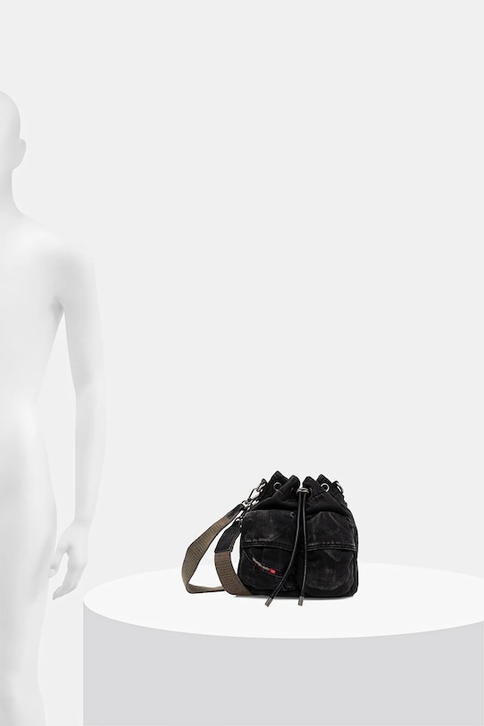 Небольшая сумочка из коллекции Diesel. Модель на молнии, выполнена из текстиля. - Камера затягивается шнурками. - Имеет съемную ручку и съемный регулируемый ремень. - Не подходит для формата А4. - Модель на подкладке. - Внешние карманы. - Внутренний карман на молнии. - Минимальная длина ремешка: 92 см. - Максимальная длина ремня: 128 см. - Длина ручки: 50 см. - Глубина: 13 см. - Высота: 24 см. - Ширина у основания: 22 см.