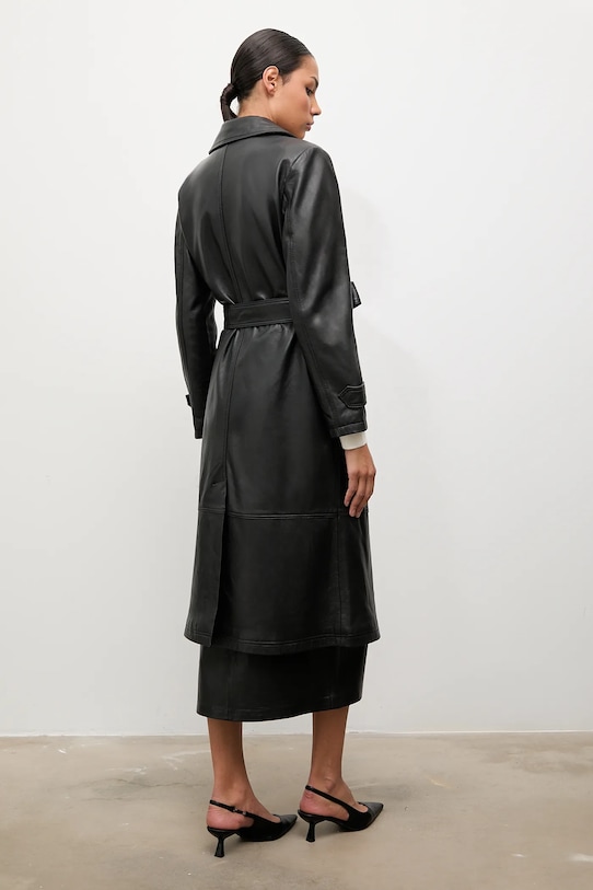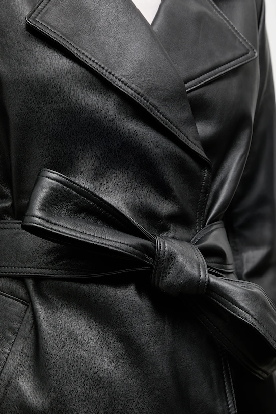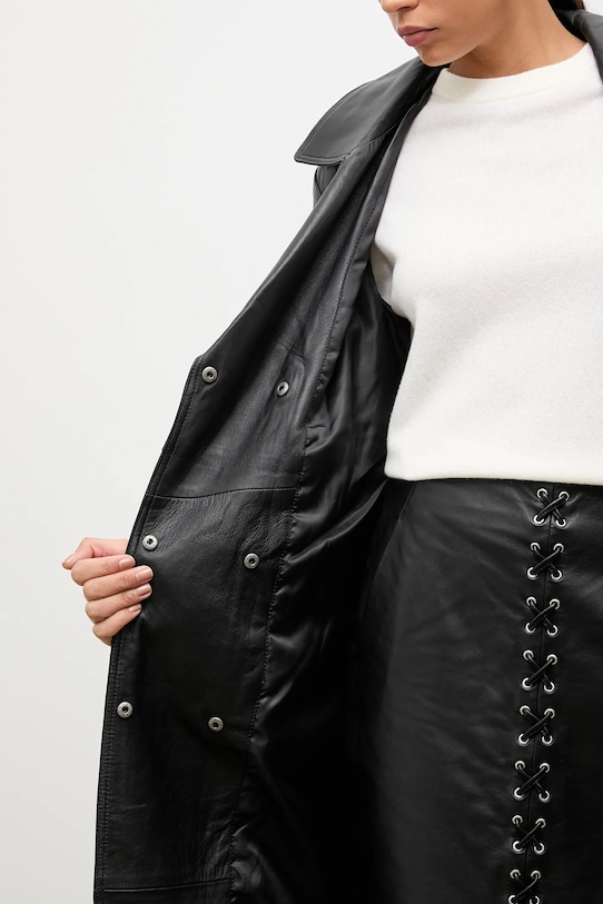 Пальто из коллекции Answear.Lab. Это пальто без подкладки выполнено из натуральной кожи. Модель выполнена из исключительно комфортного и высококачественного материала. - Простой дизайн, не стесняющий движений. - Двубортный пиджак с застежкой на кнопки. - Классические лацканы. - Два боковых накладных кармана. - В комплект входит кожаный ремешок. - Длина рукава: 57 см. - Длина: 109 см. - Ширина под мышками: 45 см. - Ширина плеч: 40 см. - Размеры указаны для размера: S.