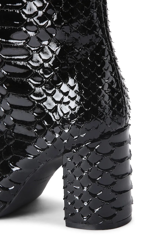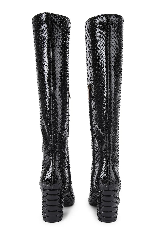 Эти лакированные ботинки из коллекции Kurt Geiger London отличаются эффектным мерцающим верхом. - Заостренный, жесткий нос. - Усиленный задник стабилизирует пятку и удерживает ногу в обуви, не давая ей выскользнуть во время движения. - Пластиковая подошва прочная и устойчивая к повреждениям. - Модель с блочным каблуком. - Контурная стелька поддерживает свод стопы и обеспечивает длительный комфорт. - Мягкая подкладка из текстильного материала предотвращает раздражение и обеспечивает высокий комфорт при ношении. - Удобная застежка-молния сбоку позволяет легко надевать и снимать. - Верхняя окружность: 37 см. - Высота вала: 40 см. - Высота каблука: 8 см.