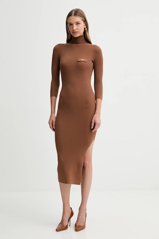 Это платье из коллекции Elisabetta Franchi выполнено из гладкого трикотажа. Модель выполнена из исключительно комфортного материала с высоким содержанием лиоцелла. - Приталенный крой, подчеркивающий силуэт. - Модель с высоким воротом. - Ребристая структура материала делает его чрезвычайно гибким и идеально прилегает к телу. - Имитация нагрудных карманов. - Рукава три четверти с буфами. - Длина рукава: 40 см. - Ширина под мышками: 34 см. - Ширина талии: 27 см. - Длина: 117 см. - Размеры указаны для размера: 36.