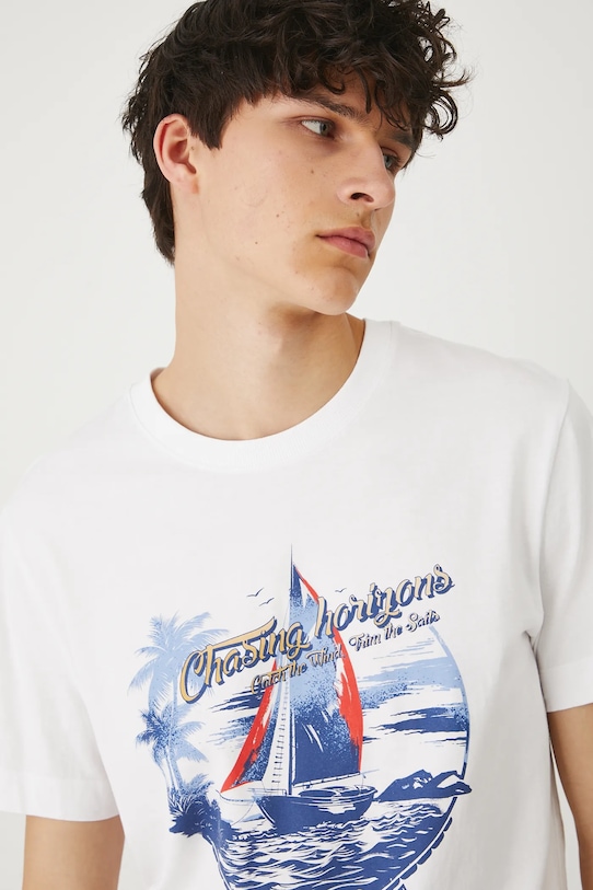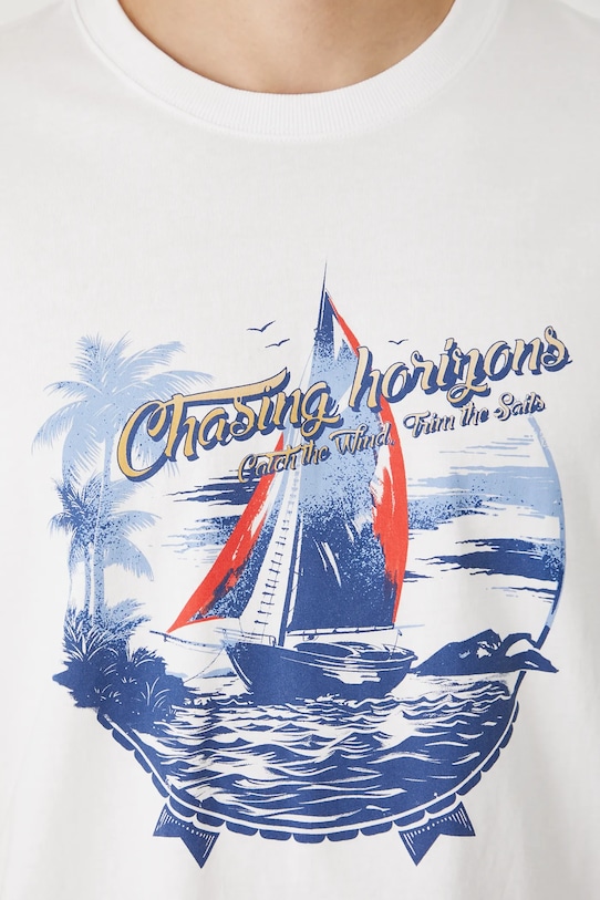 - Спереди принт со словами: «В погоне за горизонтом. Лови ветер. Расправь паруса».