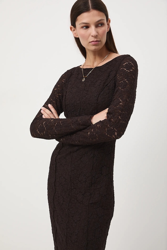 Платье из коллекции «Medicine». Приталенного кроя, выполнено из кружевного материала. - Приталенный крой. - Длинные, прилегающие рукава. - Вырез горловины «лодочка». - Декоративная строчка. - У него есть щель. - Модель выполнена из кружевного материала. - Модель на подкладке. - Модель длины миди. - Длина: 127 см. - Ширина талии: 33,5 см. - Ширина груди: 40 см. - Длина рукава: 64 см. - Размеры указаны для размера: S.