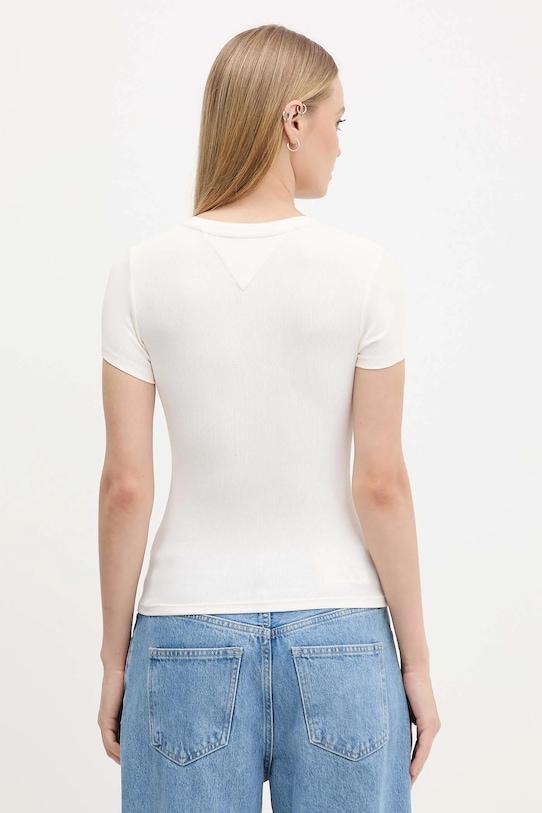 Эта футболка из коллекции Tommy Jeans выполнена из эластичного трикотажа в рубчик. Она изготовлена из дышащего материала с высоким содержанием хлопка. Модель частично изготовлена из хлопка, полученного в результате регенеративного земледелия, что позволяет фермерам синхронизироваться с природными ритмами. Такой подход к земледелию обеспечивает более длительный отдых и восстановление растений, что приводит к лучшему питанию сельскохозяйственных животных и оздоровлению почвы. - Приталенный крой, подчеркивающий силуэт. - Круглый ребристый вырез. - Короткие, прилегающие рукава. - Модель выполнена из трикотажного полотна в рубчик, которое отличается особой эластичностью и мягкостью, благодаря чему хорошо облегает тело и обеспечивает комфорт при носке. - Графический логотип бренда спереди. - Длина: 56 см. - Ширина под мышками: 38 см. - Размеры указаны для размера: S.