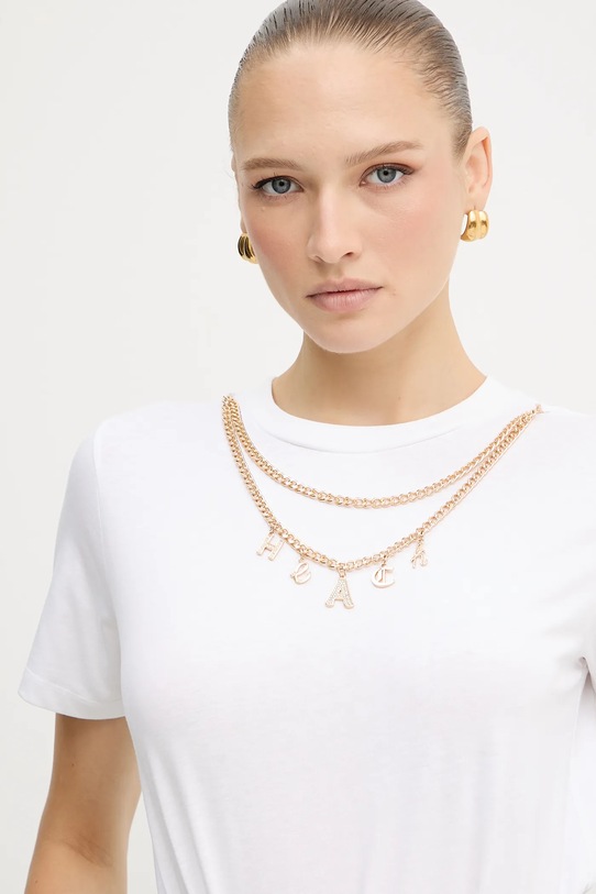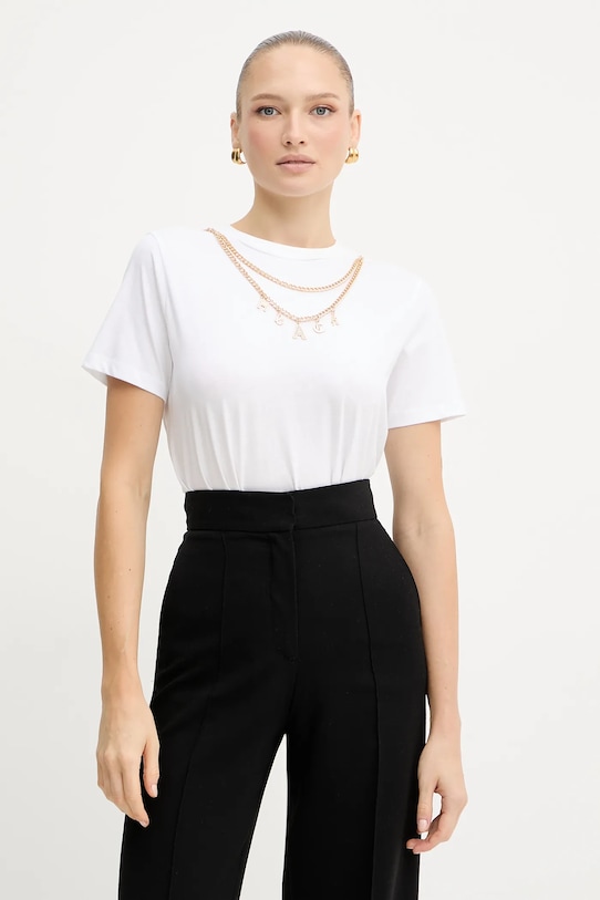 Эта футболка из коллекции Silvian Heach выполнена из тонкой, эластичной ткани на основе дышащего хлопка. - Простой дизайн, не стесняющий движений. - Круглый ребристый вырез. - Короткий рукав. - Модель со съемной декоративной цепочкой. - Длина: 65 см. - Ширина под мышками: 50 см. - Размеры указаны для размера: S.