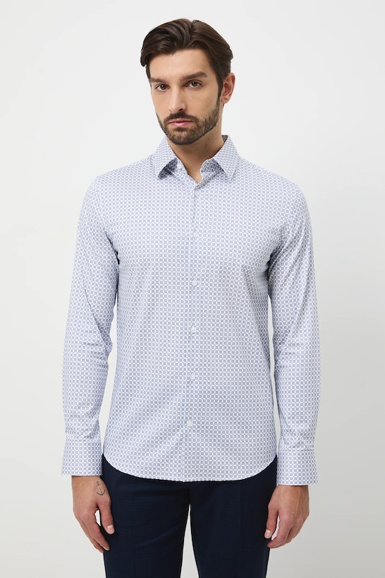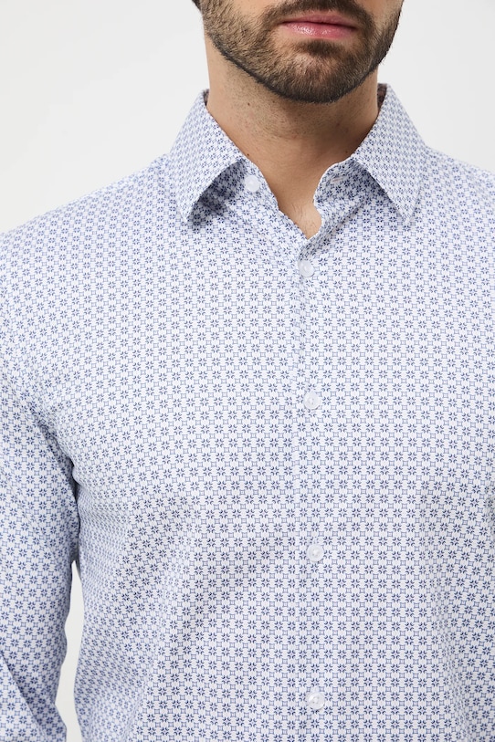 Эта рубашка из коллекции Medicine выполнена из ткани с мелким узором и имеет классический, слегка жесткий воротник. - Приталенная рубашка облегает тело, естественно подчеркивая силуэт и обеспечивая комфорт. - Длинный рукав. - Манжеты на пуговицах. - Слегка усиленный классический воротник Kent. - Застежка на пуговицы. - Ткань с мелким рисунком. - Сатиновая отделка. - Окружность воротника: 43 см. - Длина рукава: 66,5 см. - Длина: 76 см. - Ширина груди: 53,4 см. - Ширина плеч: 46 см. - Размеры указаны для размера: M.