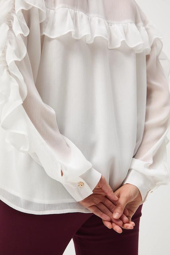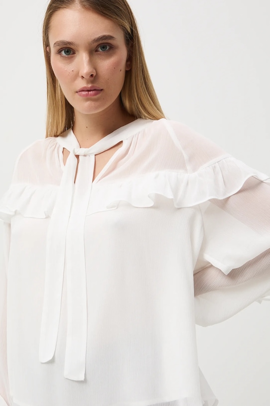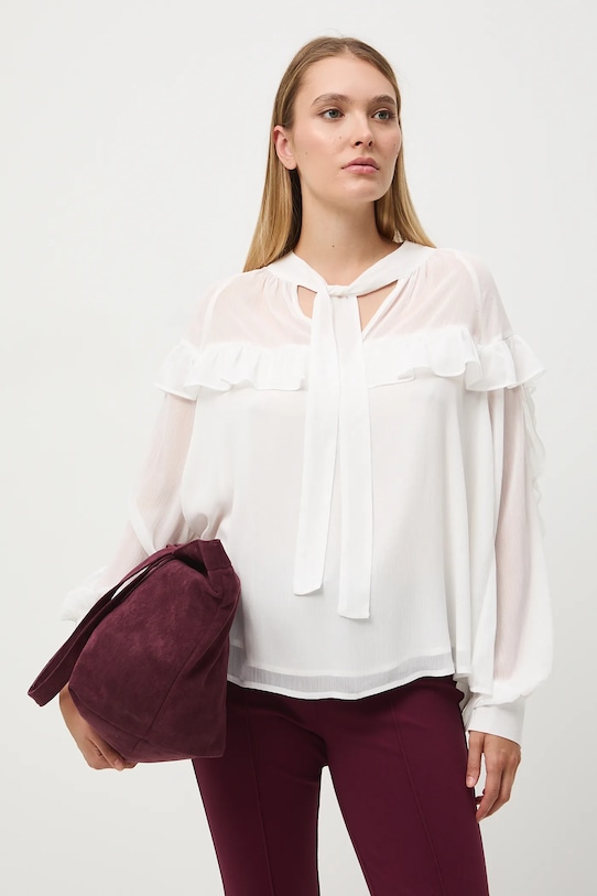 Эта блузка из коллекции Medicine выполнена из гладкой ткани и имеет заостренный вырез с завязкой. - Большой размер. - Длинные рукава реглан. - Манжеты на пуговицах. - Острый вырез с завязками. - Модель с декоративными оборками. - Гладкая ткань. - Длина рукава (от горловины): 72,5 см. - Длина: 66 см. - Ширина груди: 61 см. - Размеры указаны для размера: S.