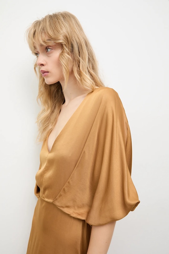 Это платье из коллекции Answear.LAB выполнено из тонкой, неэластичной ткани. Модель выполнена из исключительно комфортного материала с высоким содержанием вискозы. - Расклешенный крой. - Декоративный, заостренный вырез. - Короткий рукав. - Рукава отделаны резинкой. - Узкий эластичный пояс. - Модель без подкладки. - Модель без застежки. - Длина: 137,5 см. - Ширина под мышками: 40 см. - Ширина талии: 33 см. - Размеры указаны для размера: S.