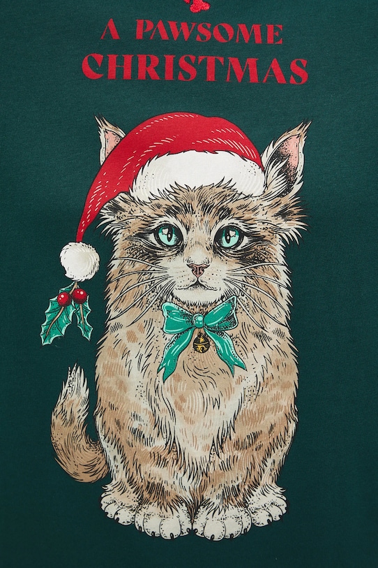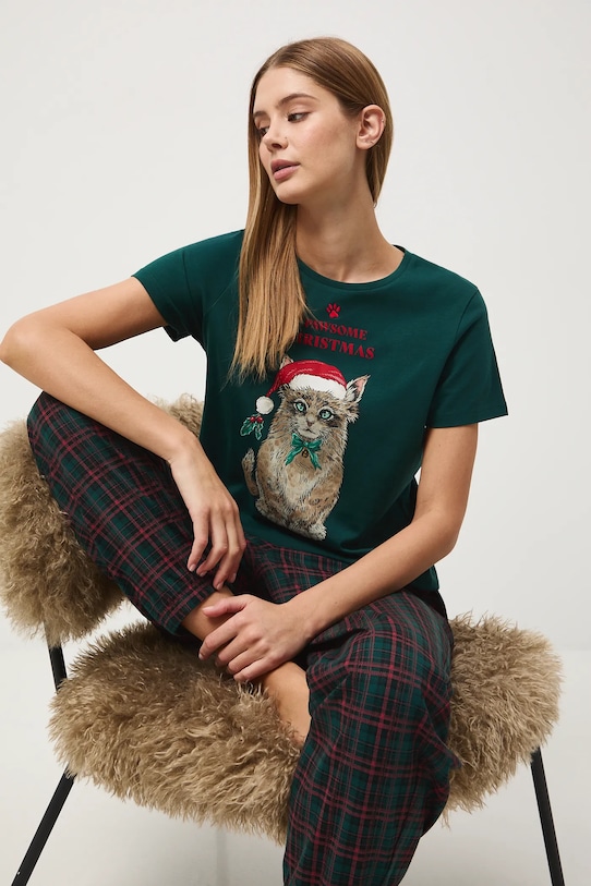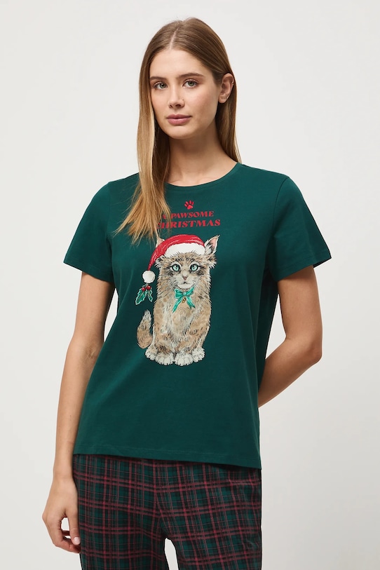 Пижама из коллекции «Medicine». Изготовлена из хлопкового трикотажа. - Простой дизайн. - Короткий рукав. - Круглый вырез. - Обхват талии обычный. - Эластичный пояс. - Ножки отделаны манжетами. - Принт с изображением животного - кота. - Печать с надписью: Счастливого Рождества. - Клетчатый узор. - Рождественская тема. - Длина: 64 см. - Ширина груди: 52 см. - Ширина талии (до растягивания): 38 см. - Ширина талии (после растяжения): 46 см. - Ширина бедер: 52 см. - Высота талии: 28 см. - Длина по внутреннему шву: 70 см. - Размеры указаны для размера: S.