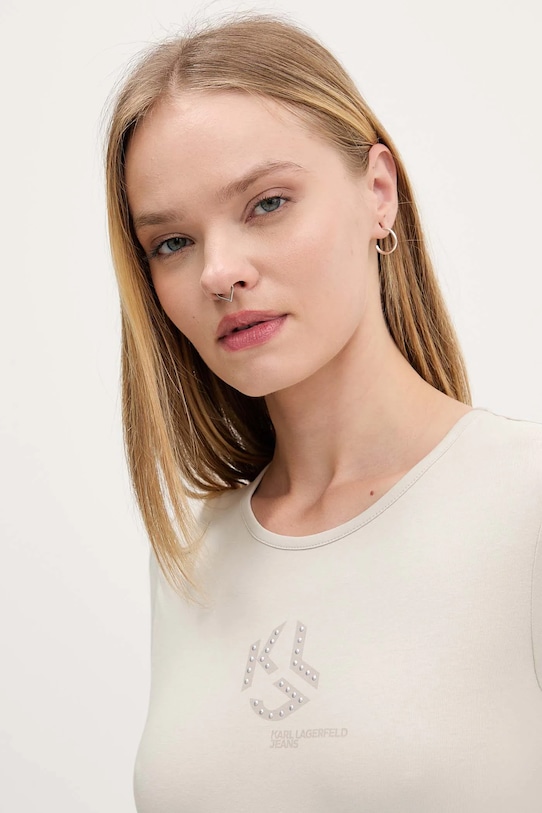 Эта футболка из коллекции Karl Lagerfeld Jeans выполнена из тонкой эластичной ткани. Модель выполнена из исключительно комфортного материала с высоким содержанием хлопка. - Этот продукт частично изготовлен из органического хлопка. - Приталенный крой, подчеркивающий силуэт. - Классический круглый вырез. - Модель с аппликацией. - Длина: 49 см. - Ширина под мышками: 41 см. - Размеры указаны для размера: S.