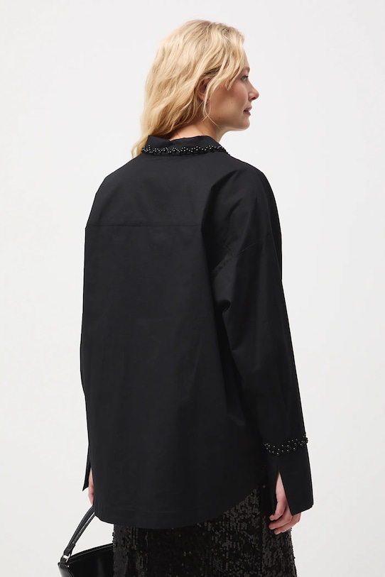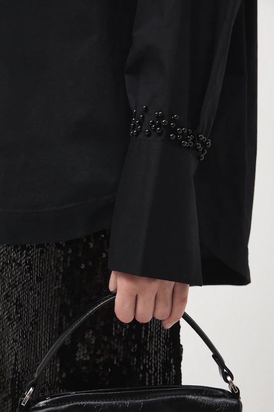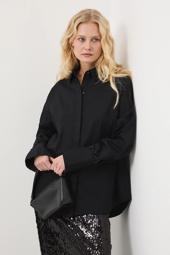 Рубашка из коллекции «Medicine». Изготовлена из ткани с аппликацией. - Большой размер. - Длинный рукав. - Заниженная линия плеча. - Декоративные разрезы внизу рукавов. - Модель с воротником. - Потайная застежка на пуговицы. - Декоративная аппликация с использованием искусственного жемчуга. - Длина спереди: 72 см. - Длина спинки: 75 см. - Ширина груди: 61 см. - Длина рукава: 53 см. - Размеры указаны для размера: S.