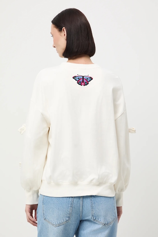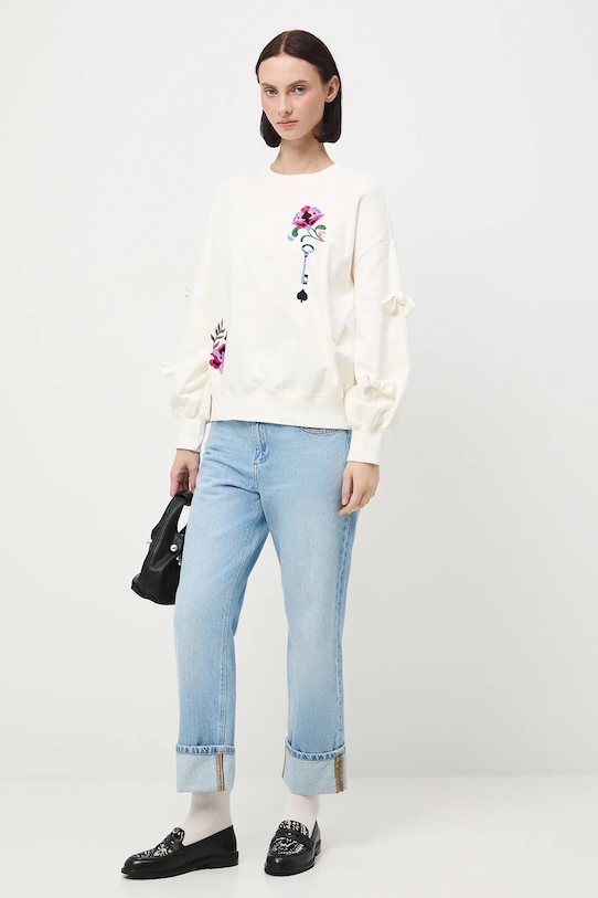 Толстовка из коллекции «Medicine». Изготовлена из трикотажного полотна с аппликацией. - Большой размер. - Круглый ребристый вырез. - Длинный рукав. - Заниженная линия плеча. - Отделка ребер. - Модель с декоративной вышивкой. - Декоративные банты на рукавах. - Трикотажное полотно интерлок с плотным переплетением. - Длина рукава (от горловины): 75 см. - Длина: 64,5 см. - Ширина груди: 62 см. - Размеры указаны для размера: S.