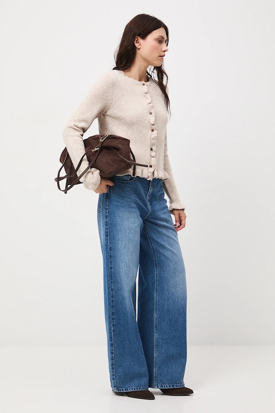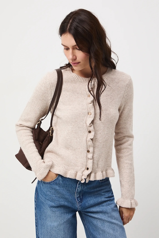 Кардиган из коллекции «Medicine». Круглый вырез горловины, выполнен из меланжевого трикотажа. - Модель выполнена из 50% шерсти. - Этот кардиган прямого кроя обеспечивает комфорт и универсальный образ. Он мягко облегает фигуру, не перетягивая её. Классический и простой, он прекрасно сочетается как с элегантными, так и с повседневными образами. - Длинный рукав. - Круглый вырез. - Застежка на пуговицы. - Модель с декоративной оборкой. - Меланжевый трикотаж. - Длина рукава: 61 см. - Длина: 55 см. - Ширина груди: 46 см. - Размеры указаны для размера: S.