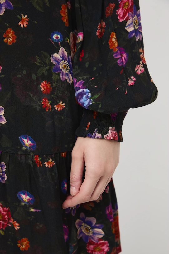 Платье из коллекции «Medicine». Расклешенный фасон из узорчатой ткани. - Расклешенный крой. - Длинные рукава. - Рукава отделаны ребристыми манжетами. - Модель с воротником-стойкой. - Застегивается на пуговицы сзади. - Модель с декоративной оборкой. - Узорчатая ткань. - Узор с растительным мотивом. - Расположение узора может отличаться на каждом изделии. - Модель мини-длины. - Длина рукава: 62,5 см. - Ширина груди: 50 см. - Длина: 92 см. - Размеры указаны для размера: S.