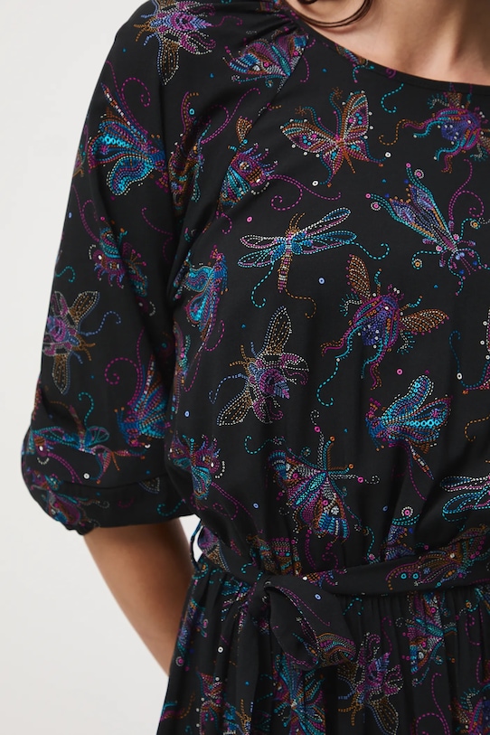Платье из коллекции «Medicine». Расклешенный фасон из узорчатой ткани. - Расклешенный крой. - Рукав реглан. - Рукав три четверти. - Рукава отделаны резинкой. - Круглый вырез. - Эластичный пояс. - Текстильный ремешок в комплекте. - Застегивается на пуговицы сзади. - Модель с декоративными оборками. - Узорчатая ткань. - Модель мини-длины. - Узор с изображением животных. - Ширина талии (до растягивания): 32 см. - Ширина талии (после растяжения): 54 см. - Ширина груди: 48 см. - Длина: 91,5 см. - Размеры указаны для размера: S.