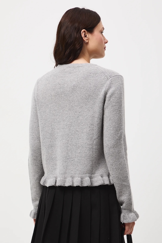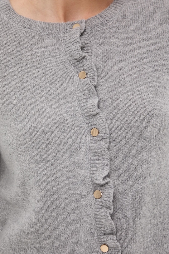 Кардиган из коллекции «Medicine». Круглый вырез горловины, выполнен из меланжевого трикотажа. - Модель выполнена из 50% шерсти. - Этот кардиган прямого кроя обеспечивает комфорт и универсальный образ. Он мягко облегает фигуру, не перетягивая её. Классический и простой, он прекрасно сочетается как с элегантными, так и с повседневными образами. - Длинный рукав. - Круглый вырез. - Застежка на пуговицы. - Модель с декоративной оборкой. - Меланжевый трикотаж. - Длина рукава: 61 см. - Длина: 55 см. - Ширина груди: 46 см. - Размеры указаны для размера: S.