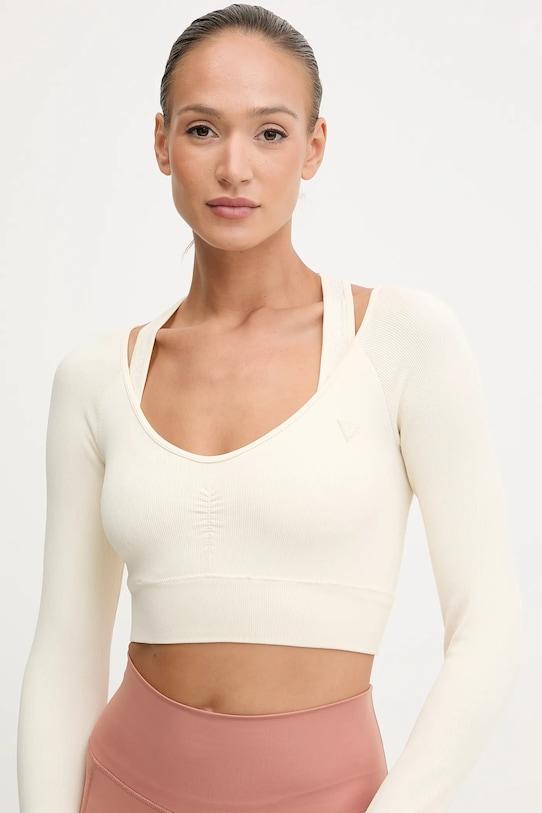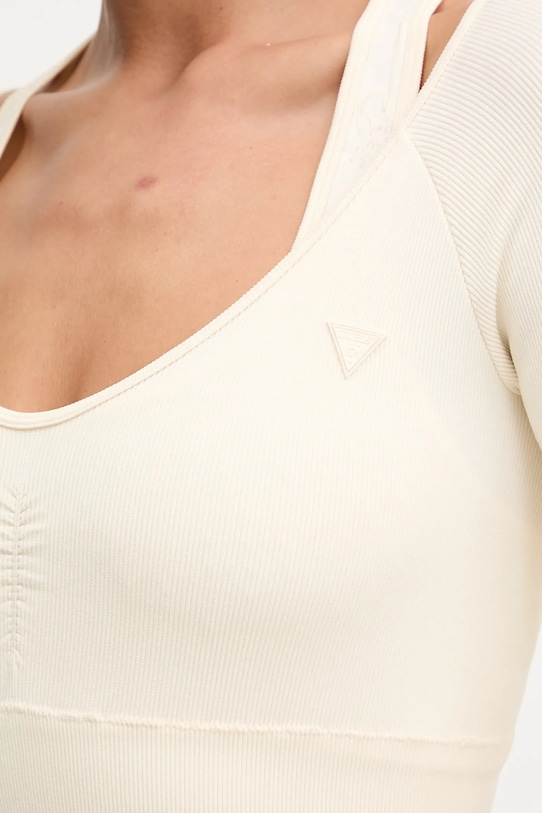Этот лонгслив из коллекции Guess выполнен из тонкой, высокоэластичной ткани. Полиамид обеспечивает повышенную прочность. - Приталенный крой, подчеркивающий силуэт. - Рукава реглан благодаря своей конструкции обеспечивают большую свободу движений. - Дополнительный слой материала в виде подкладки увеличивает площадь покрытия. - Классический круглый вырез. - Модель выполнена из трикотажного полотна в рубчик. - Длина рукава (от горловины): 60 см. - Длина: 30 см. - Ширина под мышками: 33 см. - Указаны размеры: XS/S.