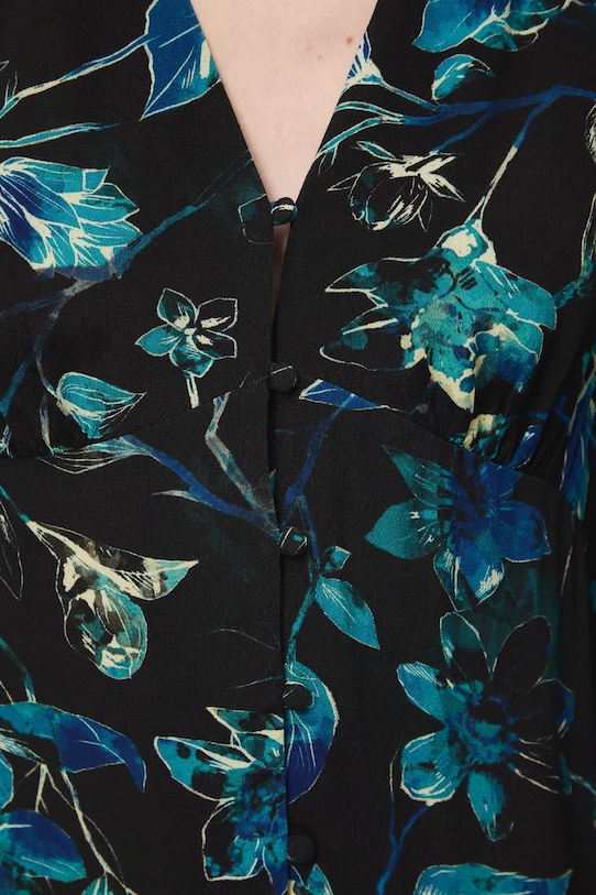 Платье из коллекции «Medicine». Расклешенный фасон из узорчатой ткани. - Расклешенный крой. - Длинные рукава. - Рукава отделаны резинкой. - Острый вырез. - Застежка на пуговицы. - Эластичная резинка сзади. - Модель с декоративной оборкой. - Декоративные оборки. - Узорчатая ткань. - Узор с растительным мотивом. - Расположение узора может отличаться на каждом изделии. - Модель длины миди. - Ширина талии (до растягивания): 36 см. - Ширина талии (после растяжения): 47,5 см. - Ширина груди: 49,5 см. - Длина: 124,7 см. - Размеры указаны для размера: S.