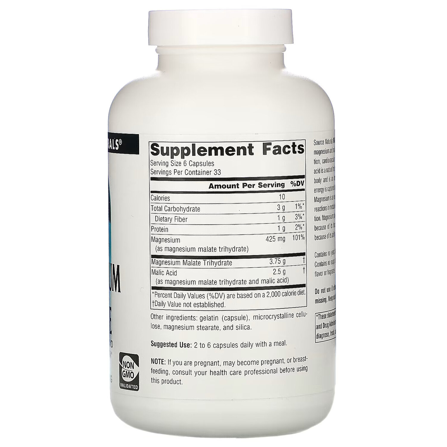 Препарат «Яблочнокислый магний» от Source Naturals сочетает в себе магний и яблочную кислоту. Он поддерживает мышечную функцию, здоровье сердечно-сосудистой системы и способствует производству энергии. Яблочная кислота — натуральная фруктовая кислота, содержащаяся в большинстве клеток организма и участвует в цикле Кребса, в котором энергия сохраняется во время метаболизма углеводов и жиров. Магний — кофактор, необходимый для более чем 300 ферментных реакций метаболизма, синтеза АТФ и производства энергии. Магний играет важную роль в расслаблении мышц, поскольку является кофактором ферментов, а также способен уравновешивать уровень кальция в клетках.