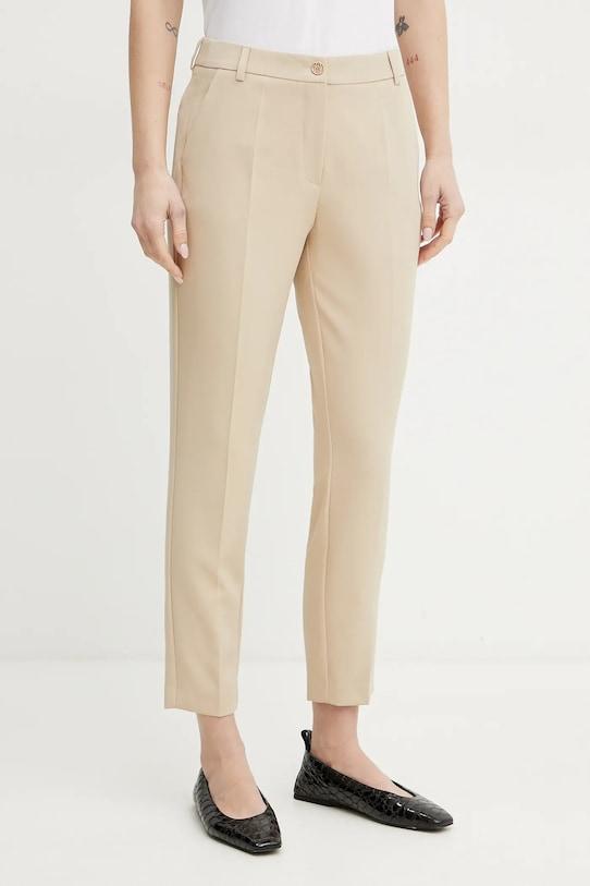 Брюки из коллекции Fracomina изготовлены из тонкой, слегка эластичной ткани. Полиэстер обеспечивает повышенную устойчивость к сминанию. - Приталенный крой, подчеркивающий силуэт. - Модель со стандартной талией, застежкой на пуговицы и молнию. - Два накладных кармана на ягодицах. - Штанина отутюживается в складку.