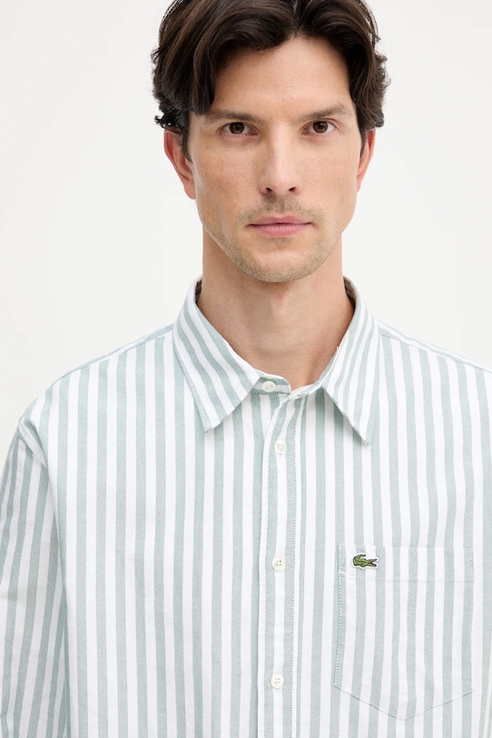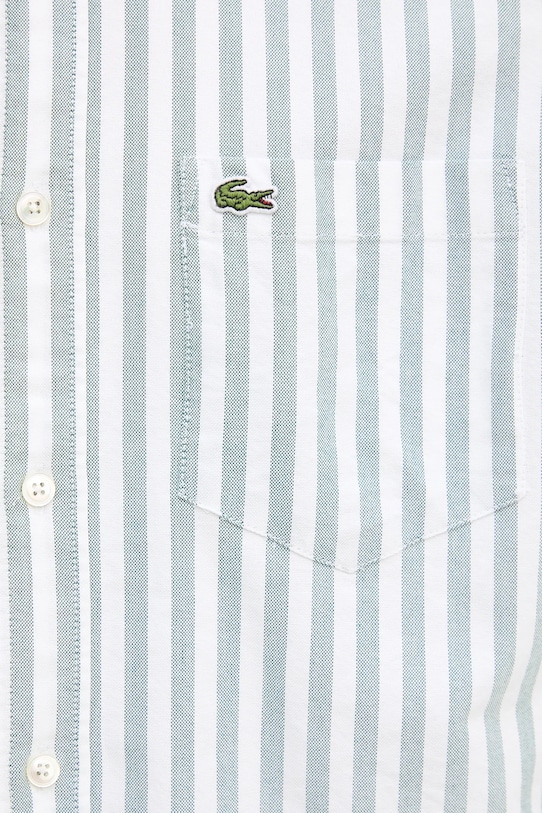 Рубашка из коллекции Lacoste из хлопчатобумажной ткани. - Изделие изготовлено из органического хлопка. - Рубашка прямого кроя мягко облегает фигуру, но не подчеркивает ее, обеспечивая свободу движений. - Удобная застежка на кнопки позволяет легко надевать и снимать. - Манжеты на пуговицах. - Нагрудный карман. - Модель с нашивкой на груди. - Длина: 71 см. - Длина рукава: 66 см. - Ширина под мышками: 55 см. - Ширина плеч: 45 см. - Размеры указаны для размера: 41.