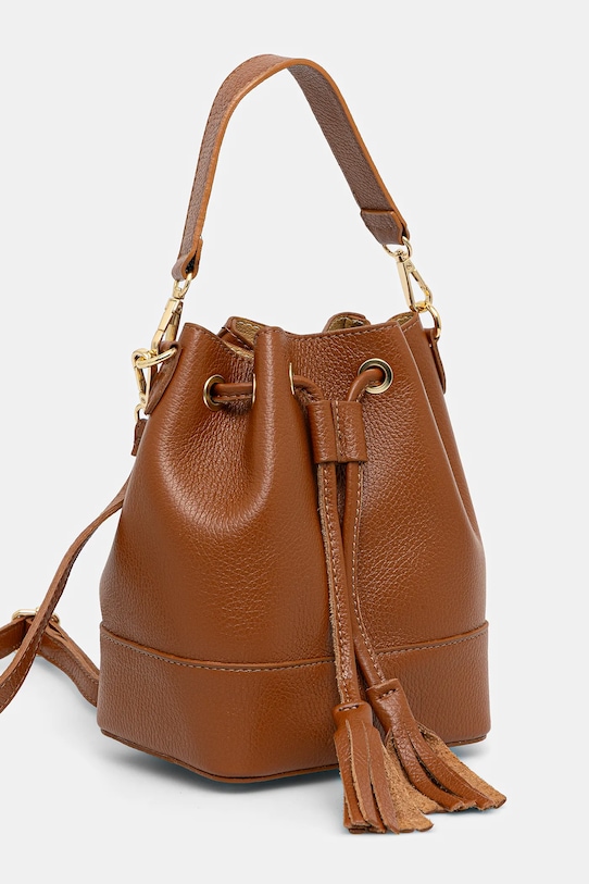 Небольшая сумочка из коллекции Answear.Lab. Модель на молнии из натуральной кожи. - Камера затягивается шнурками. - Модель без подкладки. - Внутренний накладной карман для удобного и безопасного хранения мелких предметов. - Сумка для ношения в руке или на плече. - Имеет съемную ручку и съемный регулируемый ремень. - Не подходит для формата А4. - Входящий в комплект тканевый чехол защищает изделие от пыли. - Минимальная длина ремешка: 65 см. - Длина ручки: 35 см. - Максимальная длина ремня: 116 см. - Глубина: 12 см. - Высота: 22,5 см. - Ширина у основания: 18 см.