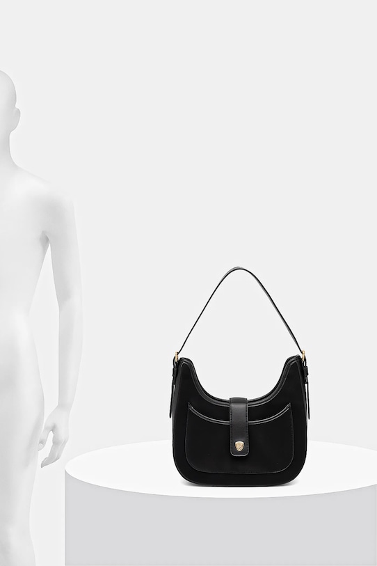 Сумка среднего размера из коллекции Blauer. Модель на молнии выполнена из комбинации текстиля и экокожи. - Застежка-молния и кнопки. - Передний карман с магнитной застежкой. - Имеет два внутренних кармана: один прорезной, другой на молнии. - Несъемный, регулируемый ремешок. - Минимальная длина ремешка: 36 см. - Максимальная длина ремня: 60 см. - Глубина: 6 см. - Высота: 25 см. - Ширина у основания: 27 см.