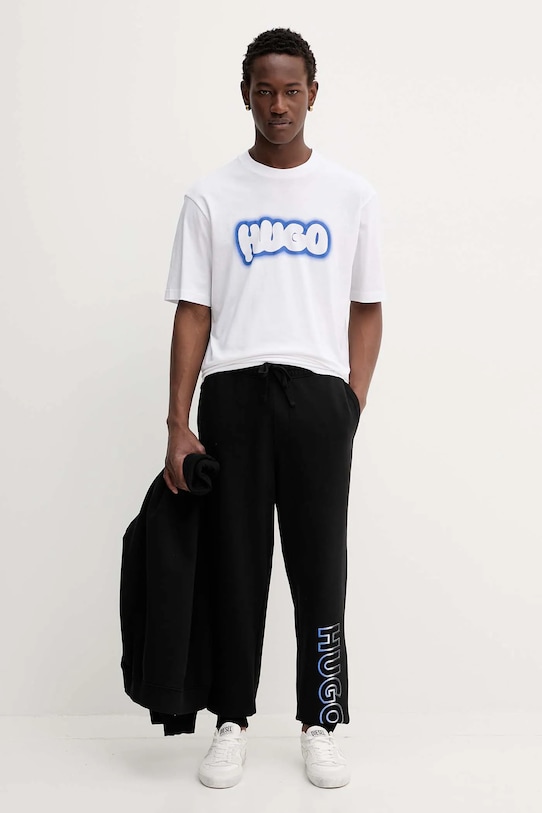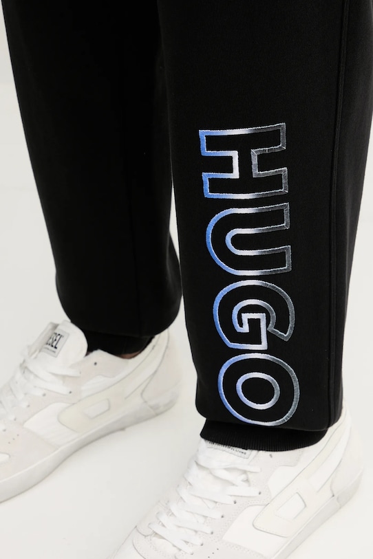 Эти спортивные брюки из коллекции Hugo Blue изготовлены из тонкого, эластичного трикотажа. Они изготовлены из исключительно комфортного и дышащего материала, идеально подходящего для теплого времени года. - Брюки свободные в области бедер и ягодиц. - Ножки отделаны удобными эластичными манжетами. - Эластичный пояс и дополнительная регулировка ширины с помощью шнурков для предотвращения сползания во время движения. - Два боковых накладных кармана. - Накладной карман на задней стороне позволяет легко и безопасно хранить телефон или другие мелкие предметы. - Модель с аппликацией. - Ширина талии: 40 см. - Ширина бедер: 57 см. - Высота талии: 35 см. - Ширина штанины внизу: 14 см. - Ширина штанины: 33 см. - Длина внешней части штанины: 108 см. - Размеры указаны для размера: M.