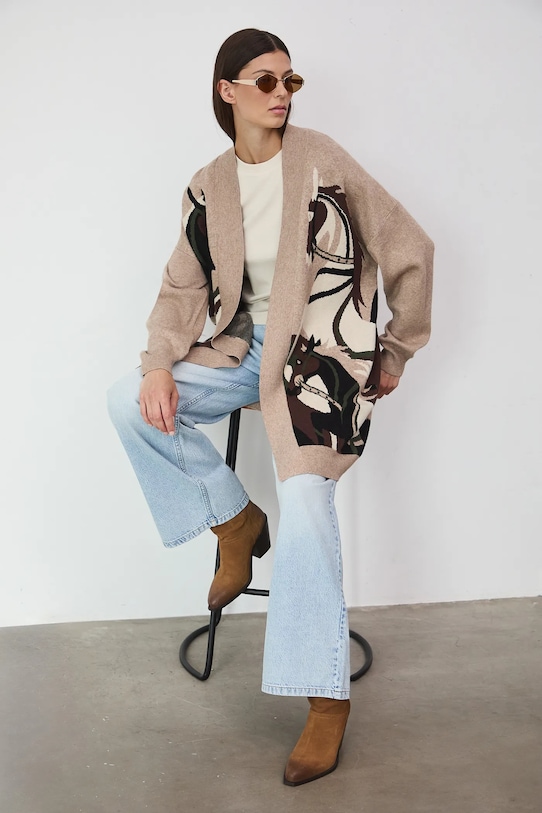 Кардиган из коллекции «Medicine». Изготовлен из узорчатого трикотажа. - Большой размер. - Длинный рукав. - Заниженная линия плеча. - Отделка ребер. - Узорчатое трикотажное полотно. - Узор с изображением животных. - Жаккардовая трикотажная ткань. - Меланжевый трикотаж. - Длина рукава (от горловины): 74 см. - Длина: 89 см. - Ширина груди: 62 см. - Размеры указаны для размера: S.