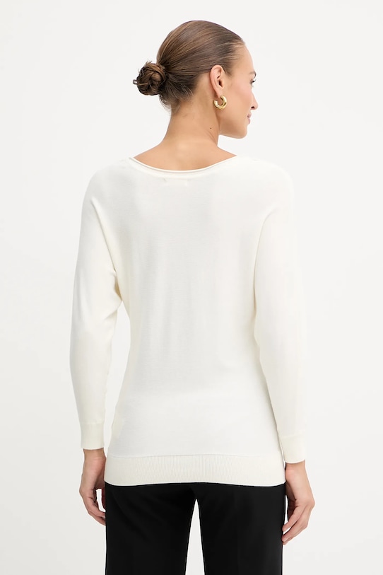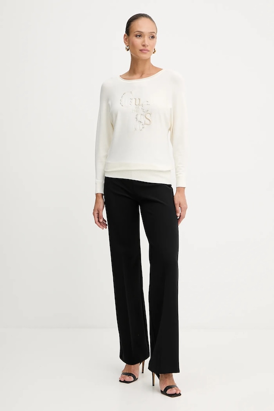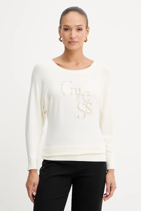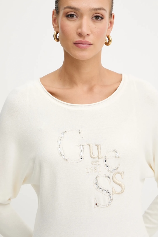 Свитер из коллекции Guess из трикотажного полотна с аппликацией. Модель выполнена из мягкого и приятного на ощупь материала. - Изготовлено из экологически чистого материала LENZING ECOVERO. LENZING ECOVERO производится из органической целлюлозы и древесной массы, используя на 50% меньше воды, чем популярная вискоза. - Свитер оверсайз обеспечивает комфорт и свободу движений. Он дополняет самые разные стили, подчёркивая непринуждённый характер любого наряда. - Рукав три четверти. - Классический круглый вырез. - Модель с декоративной вышивкой. - Тонкий, эластичный трикотаж. - Рукава и нижний край отделаны удобными эластичными манжетами. - Длина рукава (от горловины): 69 см. - Длина: 71 см. - Ширина под мышками: 51 см. - Размеры указаны для размера: S.