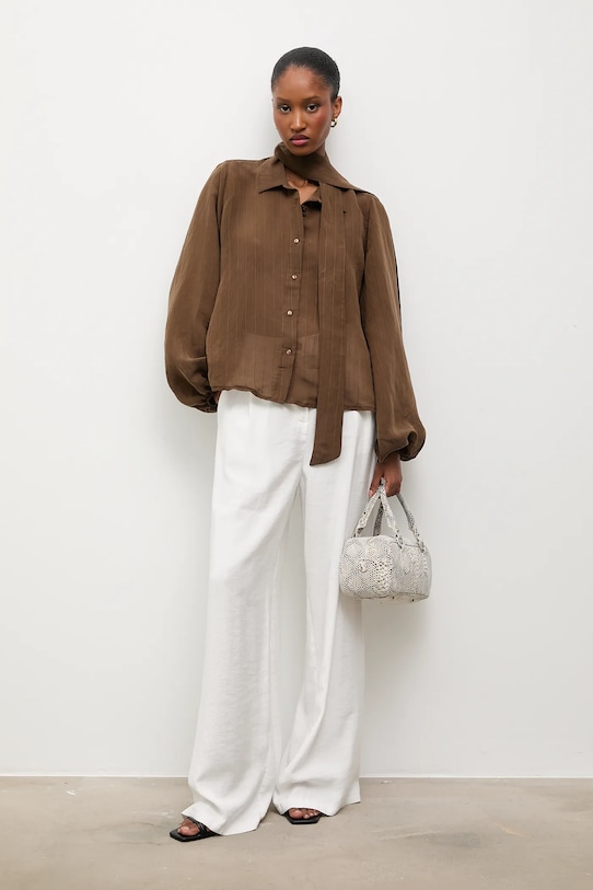 Эта рубашка из коллекции Answear.LAB выполнена из дышащей ткани. Модель выполнена из исключительно комфортной ткани с высоким содержанием модала. - Рубашка свободного кроя отличается свободным кроем, обеспечивает комфорт и не стесняет движений. - Модель с мягким воротником. - Модель с декоративной шнуровкой. - Длинные, пышные рукава. - Удобная застежка на кнопки позволяет легко надевать и снимать. - Длина рукава: 62 см. - Длина: 57 см. - Ширина под мышками: 64 см. - Размеры указаны для размера: S.