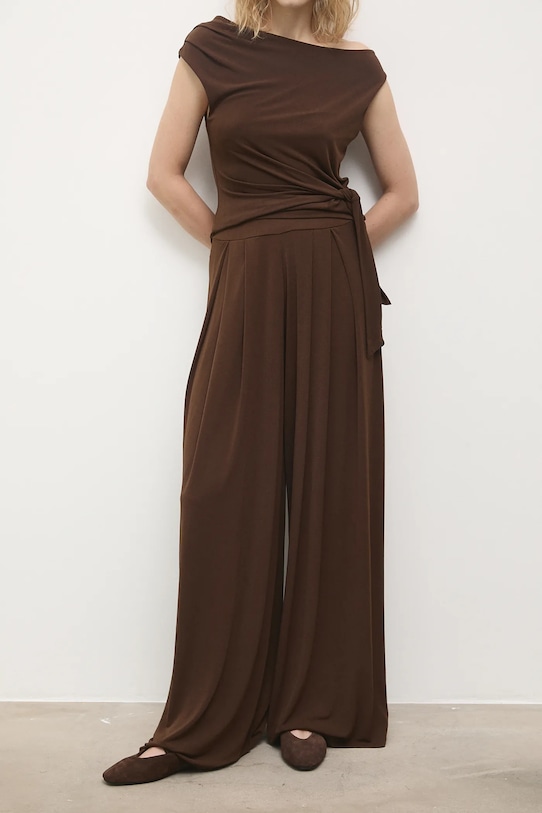 Брюки из коллекции Answear.LAB из тонкого, высокоэластичного трикотажа. Содержание полиэстера делает материал менее мнущимся. - Брюки свободные в области бедер и ягодиц. - Высокая талия обеспечивает комфорт во время занятий спортом и позволяет визуально стройнить фигуру. - Эластичный пояс предотвращает скольжение во время движения. - Широкие штанины. - Материал с декоративными складками. - Ширина талии: 36 см. - Ширина бедер: 58 см. - Высота талии: 32 см. - Ширина штанины внизу: 46 см. - Ширина штанины: 45 см. - Длина внешнего шва: 116 см. - Размеры указаны для размера: S.