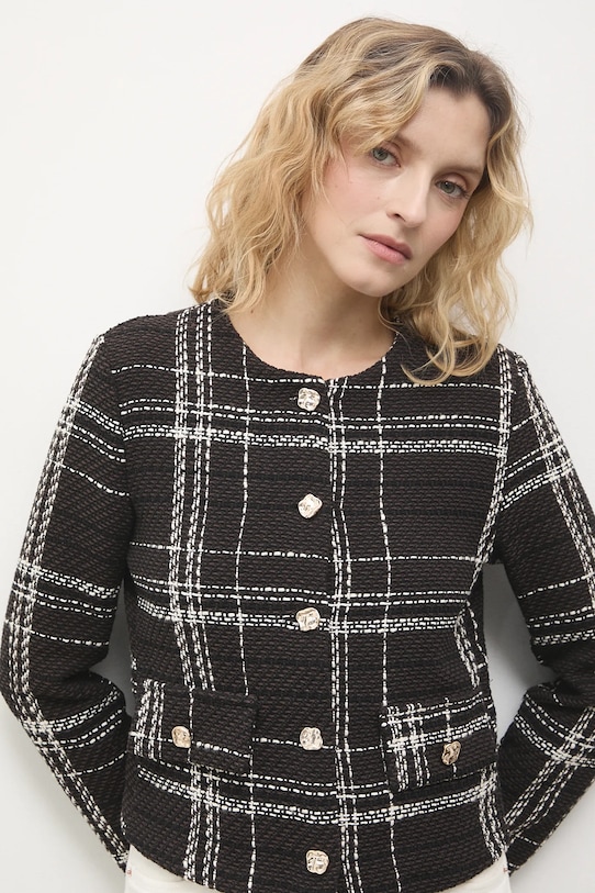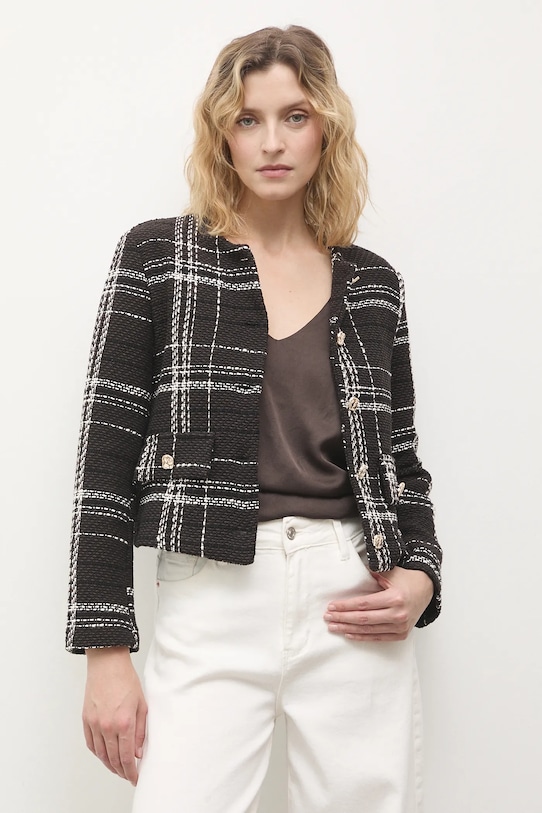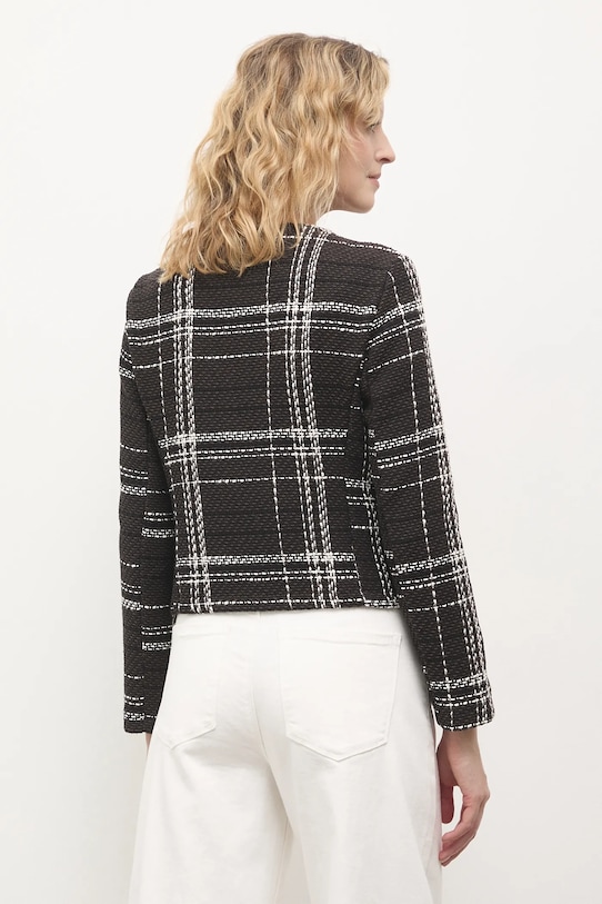 Блейзер из коллекции Answear.LAB, выполненный из ткани с узором. - Простой дизайн, не стесняющий движений. - Однобортный пиджак с застежкой на пуговицы. - Тонкая, неэластичная ткань. - Имитация карманов спереди. - Модель без подкладки. - Длина рукава: 57 см. - Длина: 50 см. - Ширина под мышками: 47 см. - Ширина плеч: 38 см. - Размеры указаны для размера: S.