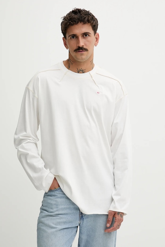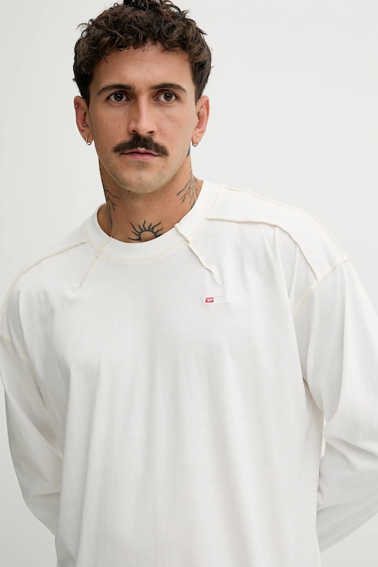 Этот лонгслив из коллекции Diesel выполнен из тонкой эластичной ткани. Модель выполнена из дышащего хлопкового материала. - Модель изготовлена из волокон, полученных с использованием экологически безопасных производственных процессов, что позволяет снизить воздействие на окружающую среду. - Простой дизайн, не стесняющий движений. - Круглый ребристый вырез. - Длинные прямые рукава. - Материал с декоративной строчкой. - Вышитый логотип бренда на груди. - Длина рукава: 65 см. - Длина: 80 см. - Ширина под мышками: 64 см. - Размеры указаны для размера: L.