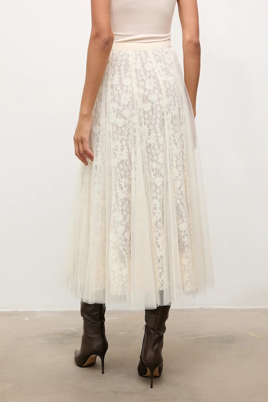 Эта юбка из коллекции Answear.LAB выполнена из тюля и кружева. Полиэстер обеспечивает повышенную устойчивость к сминанию. - Расклешенный крой. - Дополнительный слой материала в виде подкладки. - Высокая талия обеспечивает комфорт во время занятий спортом и позволяет визуально стройнить фигуру. - Эластичный пояс предотвращает скольжение во время движения. - Тонкая, гибкая ткань. - Ширина талии: 33 см. - Длина: 90 см. - Размеры указаны для размера: S.