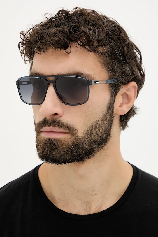 Солнцезащитные очки из коллекции HUGO. Модель с гладкими линзами и пластиковой оправой. Защита от ультрафиолета UV 400. - Изделия линейки WE ACT не менее чем на 60% изготовлены из материалов, полученных более экологичным способом. - Категория 3 (пропускает 8–18% света) - самая распространённая и универсальная категория затемняющих фильтров. Очки категории 3 идеально подходят для повседневного использования в солнечные дни и для отдыха в жарких странах. - УФ-фильтр защищает чувствительную радужную оболочку от UVA- и UVB-излучения. - В комплект модели входят чехол и салфетка для протирки очков. - Форма оправы: прямоугольная. - Ширина рамы: 143 мм. - Ширина линзы: 56 мм. - Размеры указаны для размера: 57.