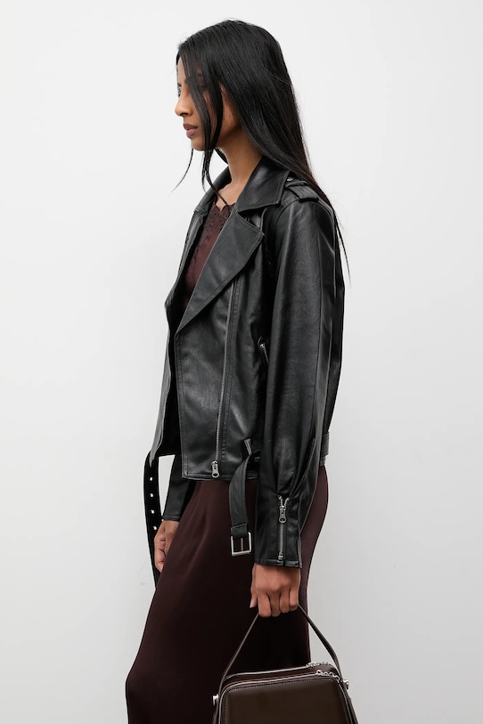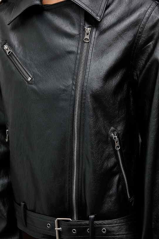 Байкерская куртка из коллекции Answear.Lab. Модель без подкладки выполнена из экокожи. Модель выполнена из исключительно комфортного и высококачественного материала. - Простой дизайн, не стесняющий движений. - Классические лацканы. - Модель на подкладке. - Молнии по низу рукавов. - Удобная застежка-молния позволяет легко надевать и снимать. - Ремешок из эко-кожи в комплекте. - Два прорезных боковых кармана на молнии. - Длина рукава: 60 см. - Длина: 56 см. - Ширина под мышками: 47 см. - Ширина плеч: 39 см. - Размеры указаны для размера: S.