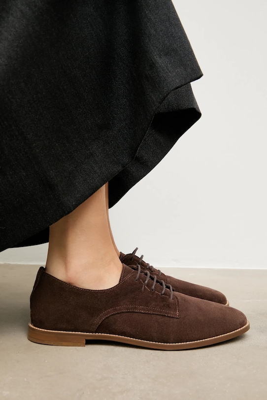 Эти туфли Answear.Lab изготовлены из замши. Они оснащены кожаной подкладкой, которая обеспечивает комфорт и предотвращает натирание, потертости и появление неприятного запаха. - Круглый, жёсткий носок. - Усиленный задник обеспечивает отличную поддержку лодыжки и пятки. - Классическая шнуровка позволяет индивидуально подогнать обувь по ноге. - Кожаная стелька комфортна для стопы и предотвращает натирание, потертости и появление неприятного запаха. - Длина вставки: 24 см. - Размеры указаны для размера: 38.