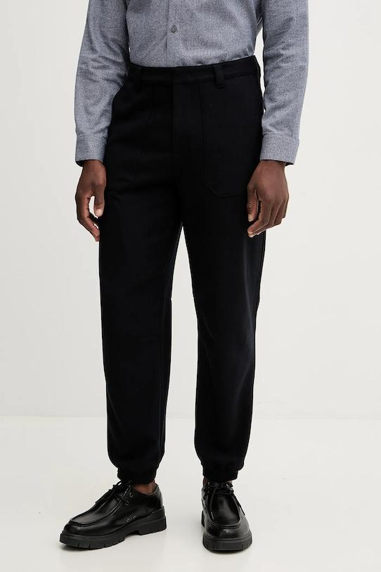 Брюки из коллекции Armani Exchange. Изготовлены из смесовой шерстяной ткани. - Застежка на молнию и крючок. - Два боковых накладных кармана. - Ножки отделаны узкой эластичной манжетой. - Два кармана на пуговицах на ягодицах. - Ширина талии: 43 см. - Высота талии: 32 см. - Ширина штанины внизу: 16 см. - Длина по внутреннему шву: 71 см. - Размеры указаны для размера: 32.