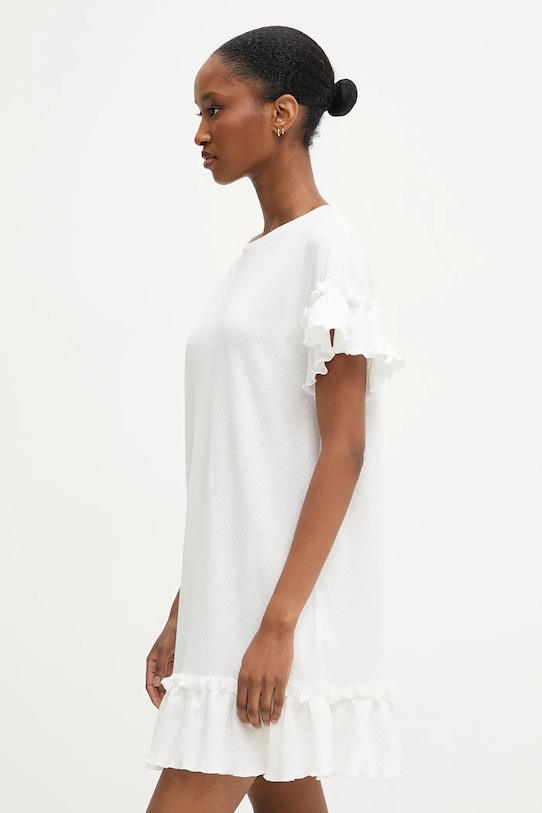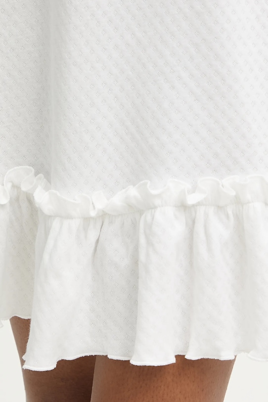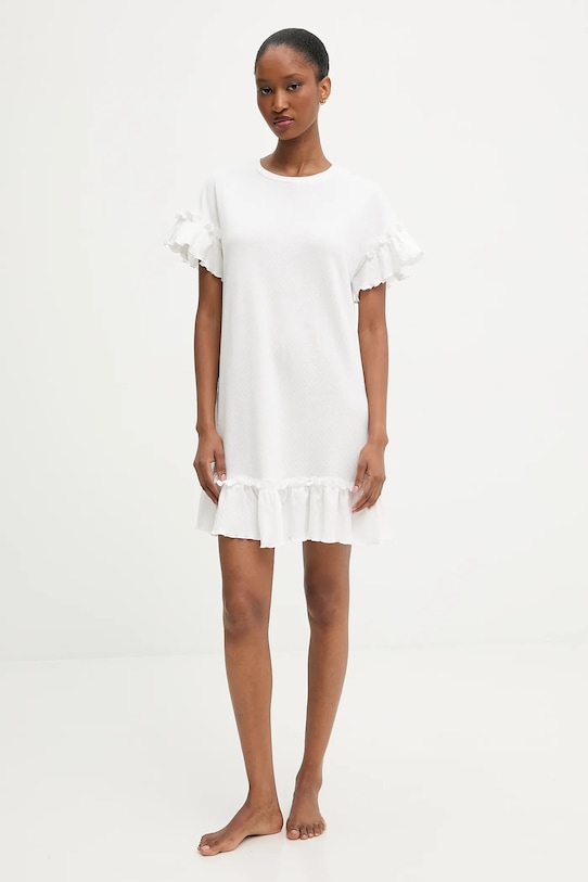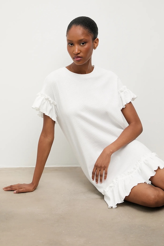 Ночная рубашка из коллекции Answear.Lab. Изготовлена из тонкой эластичной ткани. Изготовлена из дышащего хлопкового материала. - Свободный крой, обеспечивающий полную свободу движений. - Классический круглый вырез. - Крой рукава со спущенной линией плеча не ограничивает подвижность. - Привлекающие внимание оборки. - Длина: 86 см. - Ширина под мышками: 54 см. - Размеры указаны для размера: S.