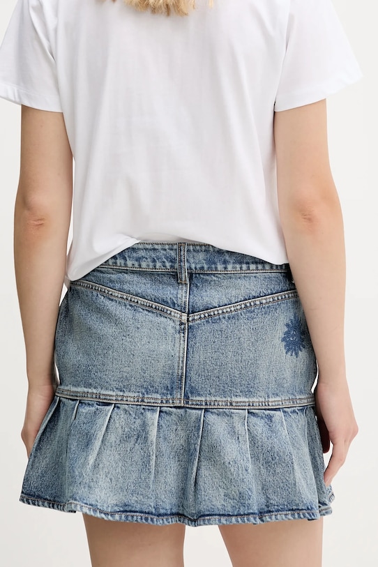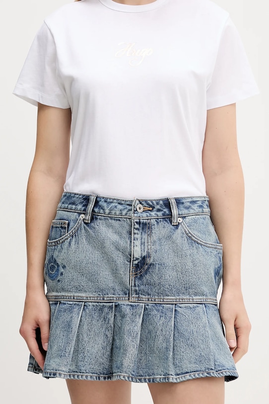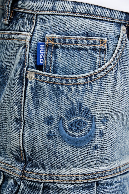 Эта юбка из коллекции Hugo Blue выполнена из потертого денима. Она изготовлена из исключительно комфортной, дышащей хлопковой ткани. - Расклешенный крой. - Модель со стандартной талией, застежкой на пуговицы и молнию. - Три накладных кармана спереди. - Материал с декоративными складками. - Модель без подкладки. - Модель с декоративной вышивкой. - Ширина талии: 38 см. - Длина: 38 см. - Размеры указаны для размера: S.