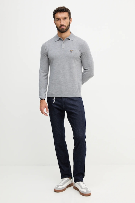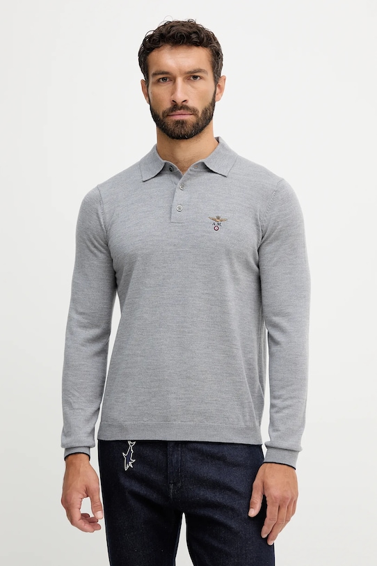Этот свитер из коллекции Aeronautica Militare выполнен из эластичного трикотажа. Высокие терморегулирующие свойства шерсти позволяют сохранять тепло в холод и прохладу в жару. - Простой дизайн, не стесняющий движений. - Застежка на короткие пуговицы обеспечивает эффективную вентиляцию и легкость надевания и снимания. - Модель с мягким воротником. - Рукава и нижний край отделаны удобными эластичными манжетами. - Вышитый логотип бренда на груди. - Длина рукава: 68,5 см. - Длина: 69,5 см. - Ширина под мышками: 55 см. - Размеры указаны для размера: M.