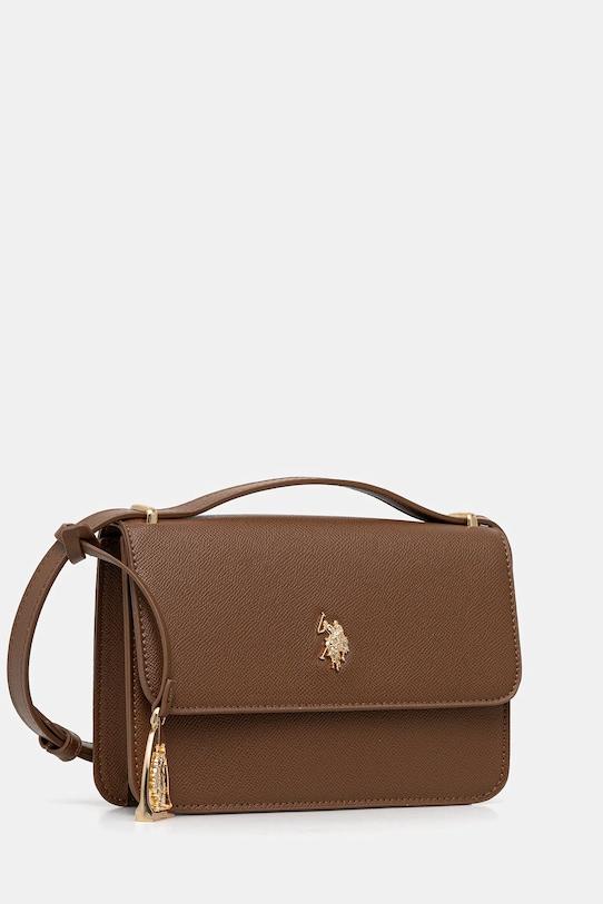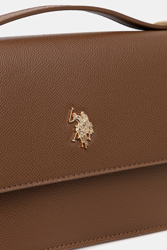 Маленькая сумочка из коллекции U.S. Polo Assn.. Модель на молнии, выполнена из экокожи. - Не подходит для формата А4. - Входящий в комплект тканевый чехол защищает изделие от пыли. - Клапан застегивается на магнит. - Имеет внутренние карманы, в том числе один на молнии. - Несъемный, регулируемый ремешок. - В комплект модели входит брелок. - Высота: 13,5 см. - Глубина: 6 см. - Ширина у основания: 18 см. - Минимальная длина ремешка: 107 см. - Максимальная длина ремня: 122 см.
