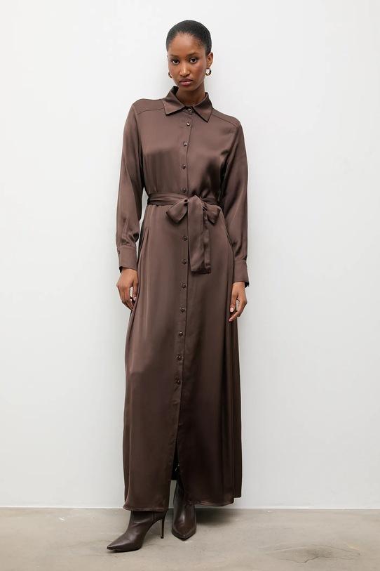 Лёгкое платье из коллекции Answear.LAB, выполненное из гладкой ткани. - Расклешенный крой. - Манжеты на пуговицах. - Модель с воротником. - Застежка на пуговицы. - Декоративные закладки. - Модель выполнена из материала атласного переплетения. - Пояс на талии корректирует фигуру и еще больше подчеркивает талию. - Тонкая, неэластичная ткань. - Длина рукава: 60 см. - Длина: 140 см. - Ширина под мышками: 50 см. - Ширина талии: 44 см. - Размеры указаны для размера: S.