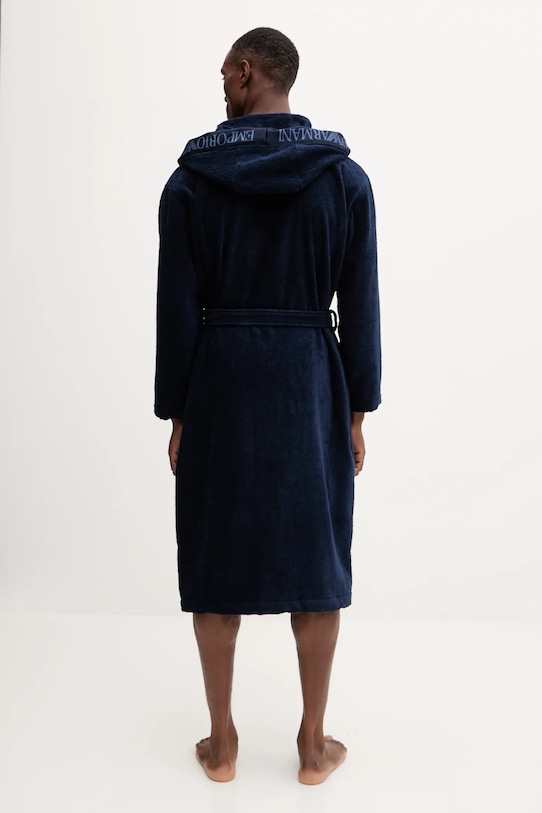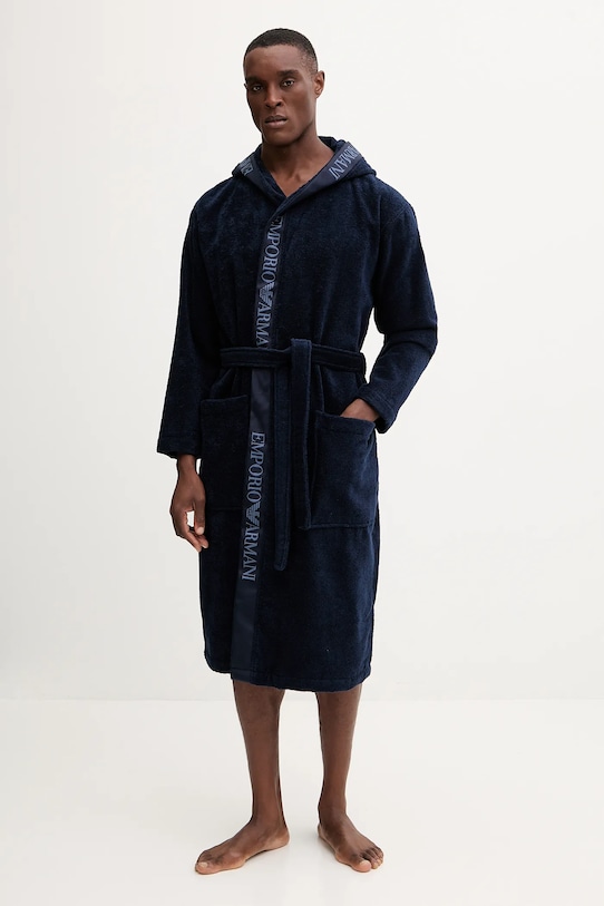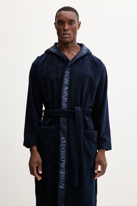 Этот халат из коллекции нижнего белья Emporio Armani выполнен из гладкой, мягкой ткани. Модель выполнена из исключительно комфортного, дышащего хлопка. - Свободный крой, обеспечивающий полную свободу движений. - Встроенный капюшон обеспечивает дополнительное тепло и защиту при необходимости. - Крой рукава со спущенной линией плеча не ограничивает подвижность. - Два накладных кармана спереди для удобного хранения мелких предметов. - Пояс на талии корректирует фигуру и еще больше подчеркивает талию. - Модель отделана окантовкой с логотипом бренда.