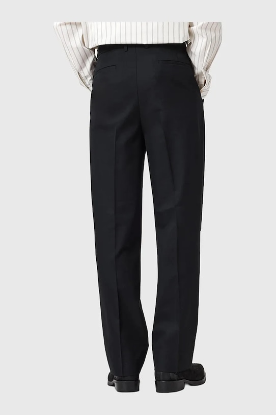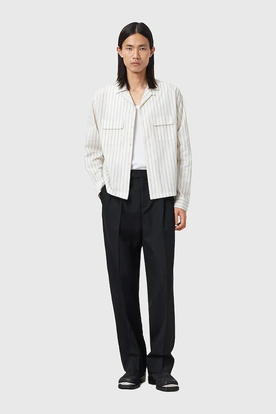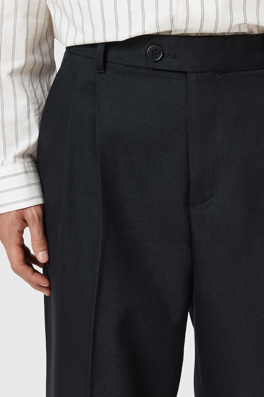 Брюки из коллекции AllSaints из гладкой ткани. Модель выполнена из исключительно комфортного, дышащего материала с высоким содержанием хлопка. - Изготовленная частично из переработанного хлопка, эта конструкция потребляет меньше воды и энергии, а также производит меньше отходов. - Данное изделие частично изготовлено из переработанного акрила. - Брюки слегка приталенные на бедрах. - Модель с высокой талией, застежкой на пуговицы и молнию. - Прямая нога полной длины. - Ножки отутюжены до складок. - Материал с декоративными складками. - Два боковых накладных кармана. - Два накладных кармана на ягодицах.