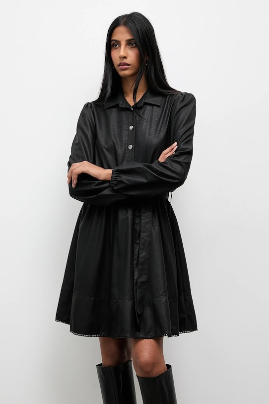 Платье из коллекции Answear.LAB из слегка эластичной ткани. - Модель мини-длины. - Расклешенный крой. - Длинные рукава. - Эластичный пояс. - Застежка на пуговицы. - Модель с воротником. - Пояс на талии. - Рукава отделаны резинкой. - Дополнительный слой материала в виде подкладки. - Длина рукава: 59 см. - Длина: 88 см. - Ширина под мышками: 43 см. - Размеры указаны для размера: S.