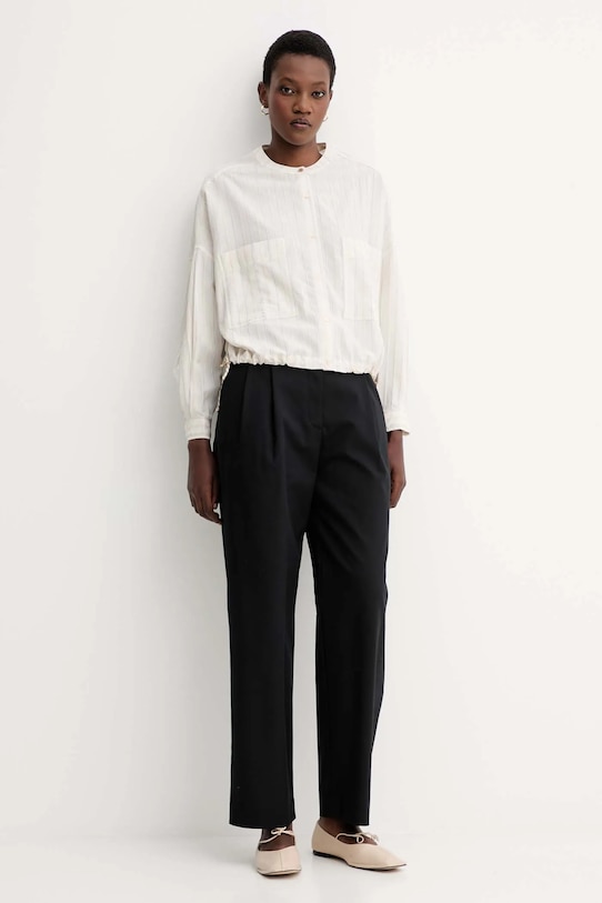 Эти брюки Calvin Klein сшиты из гладкой дышащей ткани с высоким содержанием хлопка. - Свободный крой, обеспечивающий полную свободу движений. - Коническая ножка. - Материал с декоративными складками. - Модель с высокой талией, застежкой на молнию и крючок. - Накладные карманы. - Тонкая, слегка эластичная ткань. - Ширина талии: 40 см. - Ширина бедер: 60 см. - Высота талии: 32 см. - Ширина штанины внизу: 23 см. - Ширина штанины: 35 см. - Длина по внутреннему шву: 74 см. - Размеры указаны для размера: S.