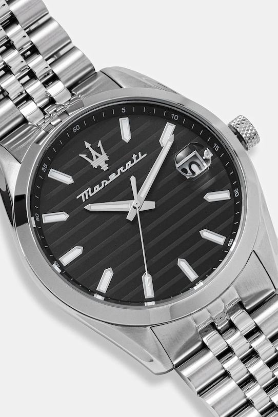 Часы из коллекции Maserati. Модель имеет круглый циферблат и сегментированный браслет. - Водонепроницаемость: WR. 50M (5ATM) - устойчив к брызгам, плаванию на поверхности. - Механизм: кварцевый, питание от батареек. - Стекло: минеральное (закаленное, очень устойчивое к ударам, трудно царапается). - Материал корпуса и браслета: нержавеющая сталь. - Модель упакована в фирменную коробку. - Ширина ремешка: 22 мм. - Толщина корпуса: 10 мм. - Диаметр корпуса: 43 мм.