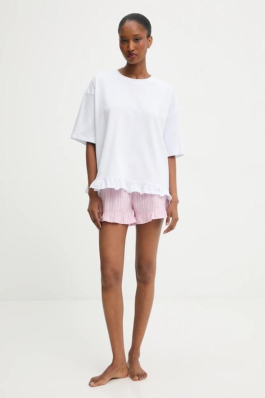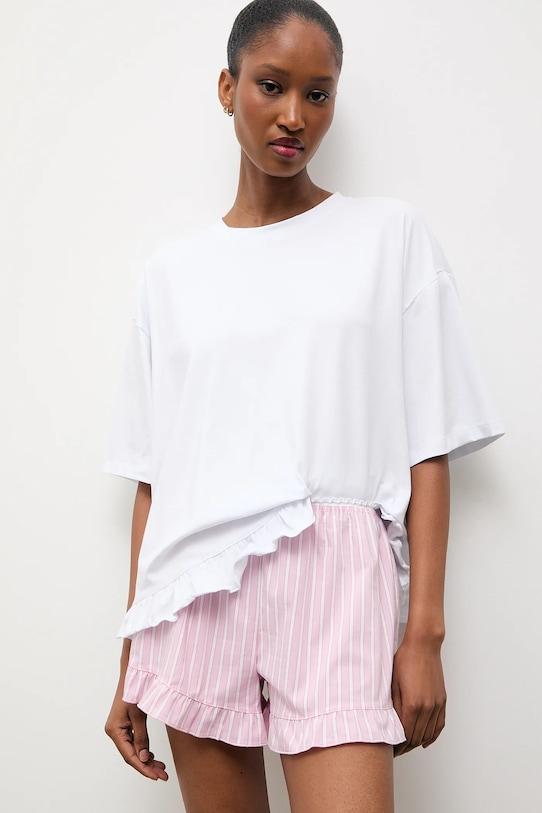 Этот пижамный комплект из футболки и шорт из коллекции Answear.Lab выполнен из комбинации различных материалов. Модель выполнена из исключительно комфортного материала с высоким содержанием хлопка. - Свободный верх и прямой низ. - Круглый ребристый вырез. - Модель с декоративной оборкой. - Кружевные вставки. - Крой рукава со спущенной линией плеча не ограничивает подвижность. - Ширина талии: 37 см. - Длина штанины: 32 см. - Длина: 63 см. - Ширина под мышками: 64 см. - Размеры указаны для размера: S.
